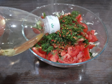 Свежую зелень мелко нарежьте и, так же, добавьте в салатник. По вкусу посыпьте салат солью и специями. В качестве специй можно воспользоваться молотым перцем. Заправьте оливковым маслом и все аккуратно перемешайте, чтобы не помять помидоры.