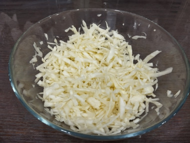 Молодую капусту тонко нашинкуйте и немного помните руками. Зачем мять руками? Это необходимо для того, чтобы капуста стала мягче и в салата была сочнее. Нашинкованную капусту переложите в чашу салатника.
