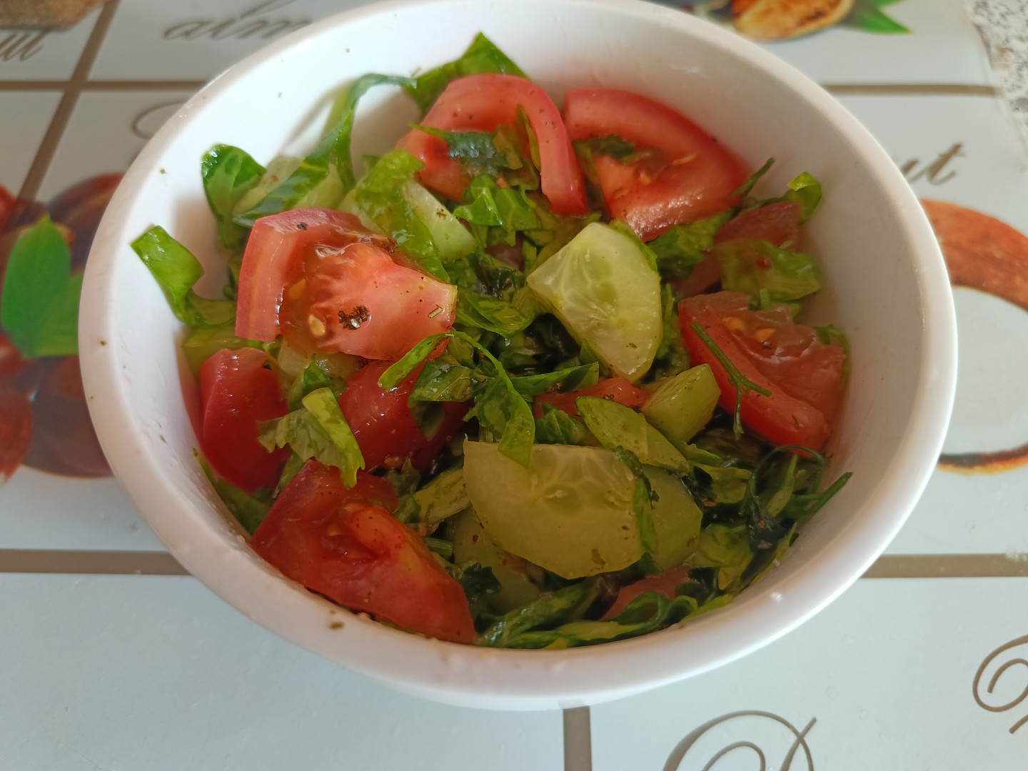 Капуста у меня не молодая,поэтому я её нашинковала и слегка помяла руками. Огурец порезала полукружками, помидоры небольшими дольками, зелень укропа мелко порезала. Смешала все ингредиенты, посолила, добавила специи для салата, масло растительное и перемешала.