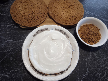 Начинаем собирать торт и выкладываем поочередно коржи на тарелку, затем наносим на них равномерным слоем приготовленный сметанный крем.
