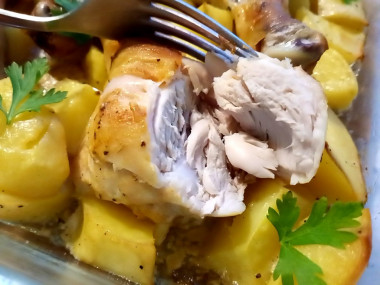 Курочка получилась сочной, ароматной и очень вкусной. Мясо хорошо пропеклось и при этом не высохло. Картошка тоже напиталась не только маринадом, но и мясным соком. Замечательный ужин без особых хлопот!