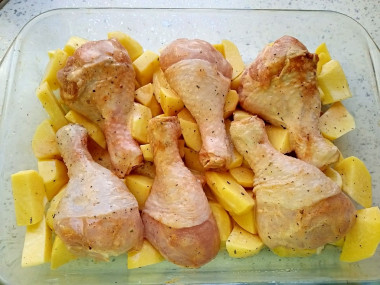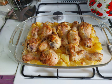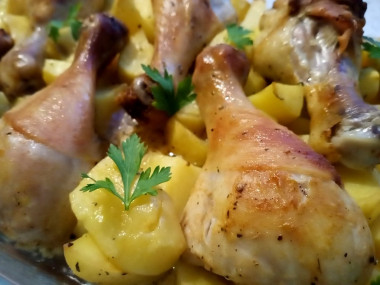 Захотелось немного снизить калорийность маринада, для этого взяла половину майонеза и разбавила его ложкой куриного бульона. Мне такой вариант понравился, только маринад стал пожиже) Добавила в него паприку и ароматные травы. Пока маривались голени, занималась картошкой. Запекала сначала один час, а потом еще 10 минут под грилем для более румяной корочки.