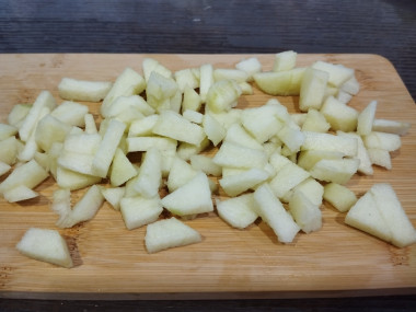 Яблоко помойте, разрежьте на четвертинки, удалите семена и срежьте кожицу. Нарежьте яблоко на небольшие кубики.