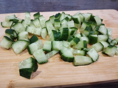 У огурца отрежьте кончики, затем снимите с него кожицу при помощи овощечистки — она срезает тонкий слой. Обязательно попробуйте огурец на вкус, не горчит ли — такой плод испортит вкус всего блюда. Нарежьте очищенный огурец на кубики.