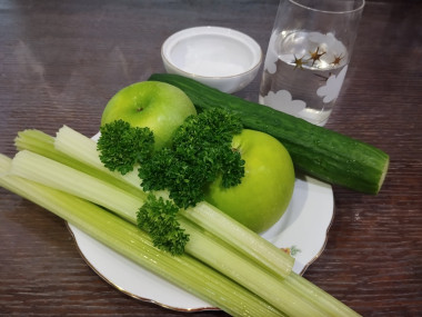 Как сделать смузи из сельдерея, огурца и яблока ПП для похудения в блендере? Подготовьте продукты. Яблоко возьмите зеленых сортов — Гренни, Голден, Семеренко. Огурец — средний, у сельдерея возьмите стебель из центра, он сочнее и мягче. Масло можете взять любое, с запахом и без, главное, чтобы оно вам нравилось. Соль и перец добавляйте по вкусу. Все овощи и зелень предварительно помойте и обсушите.