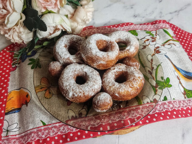 Готовые пончики выкладывайте на тарелку с бумажным полотенцем, чтобы оно впитало лишний жир. При подаче посыпьте их сахарной пудрой. Приятного аппетита!