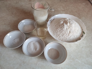 Муку я просеяла, добавила дрожжи (я использовала быстродействующие), соль,сахар, ванильный сахар и перемешала. Молоко подогрела до теплого состояния,добавила к сухим ингредиентам, масло растительное, перемешала и замесила тесто.