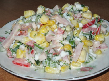 И последним слоем выложите кукурузу. Утрамбуйте салат, чтобы все слои уплотнились и салат не развалился при подаче к столу. Готовый салат поставьте на 30 минут в холодильник для пропитки.