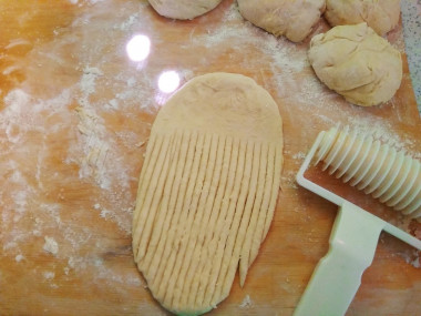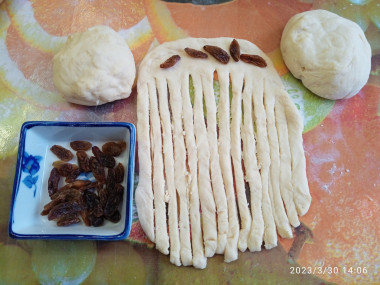 По истечению времени раскатать один шарик в продолговатый овал. С одной стороны этого овала сделать надрезы, чтобы было похоже на бахрому. А на другую сторону овала выложить немного сушеной клюквы или изюма.