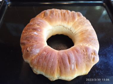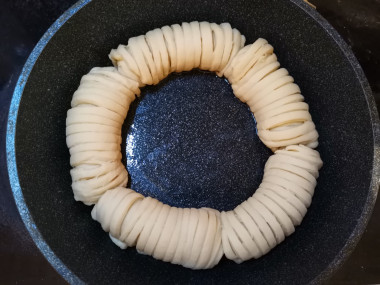 Выложить валики в форму по кругу, чтобы внутри получилась дырка. Накрыть плёнкой и дать ему постоять 60 минут при комнатной температуре, чтобы подошло и выросло в два раза. По истечении 60 минут смазать тесто сверху свежим молоком.