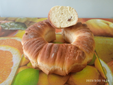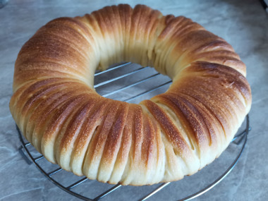 У меня, конечно, не получился хлеб такой красоты, как у автора, но ни минутки не пожалела, что попробовала его приготовить. Тесто настолько приятное для рук, что хотелось лепить из него, словно в детстве из мягкой глины. Валики с бахромой красиво смотрелись в самом начале, но после расстойки узор расплылся. Я использовала форму для саварена, в нём есть внутреннее кольцо, иначе хлеб превратился бы в обычный каравай. Мякиш воздушный, со вкусом сливок и, хотя в нём есть изюм, это всё таки хлеб. Хлеб высшего качества! Ирина, примите самые добрые слова благодарности за столь хороший рецепт!