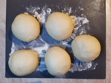 Из каждой части сформировать шарик. Когда шарики все готовы, выложить их на доску, присыпанную мукой или смазанную сливочным маслом, накрыть шарики пленкой и дать тесту отдохнуть в течение 15 минут.