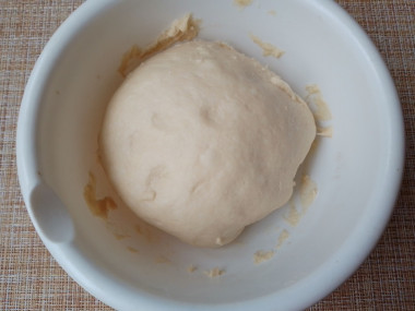 Выкладывайте собранное в комок тесто в миску и смазывайте его сверху одной столовой ложкой растительного масла, затем прикройте миску салфеткой и поставьте в теплое место на сорок минут.