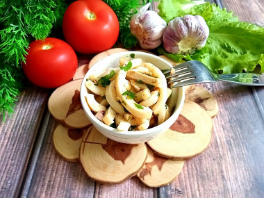 Кальмаров настаивала при комнатной температуре пару часов, т. к. в холодильнике мое оливковое масло застывает.