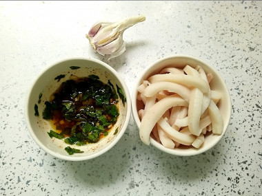 Затяните миску с кальмарами пищевой пленкой и поставьте в холодильник минимум на 1 час, а лучше на ночь, чтобы они успели хорошо промариноваться.