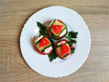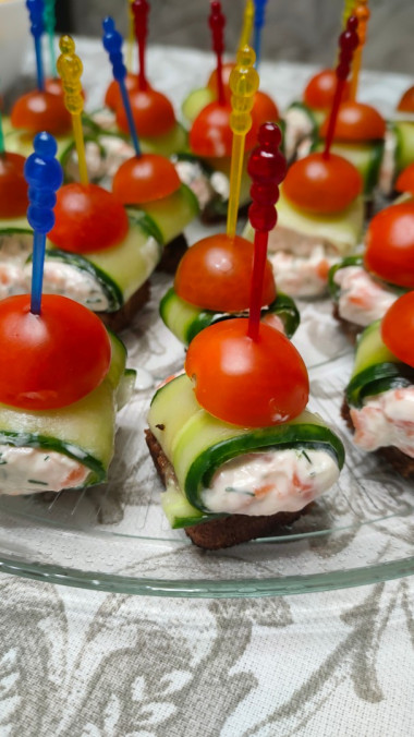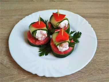 Для приготовления рулетиков из огурца с творожным сыром и красной рыбой использовала не длинные огурцы, поэтому один рулетик формировала сразу из нескольких полосок. Чтобы начинка никуда не убежала, сделала основание из колец огурца и помидора. Мне понравилось сочетание сыра фета и малосольной семги. Рулетики выглядели аппетитно и прекрасно дополняли фуршетный стол. Спасибо за идею!