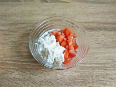 Возьмите небольшую мисочку и положите в нее нарезанные зелень и рыбу. Добавьте сыр. Сыр можете взять любой творожный, с добавками вкус будет даже интереснее. И вообще, подойдет любой мягкий сыр — фета, брынза, сливочный, маскарпоне. Учитывайте только, что некоторые сорта сыров очень соленые, рыбу тогда выбирайте малосольную.