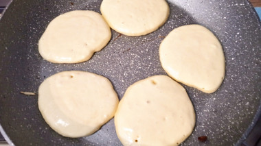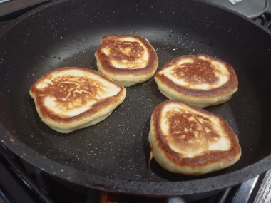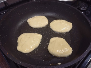 На сковороде разогрейте растильное масло. С выбором сковороды и масла для жарки поможет статья по ссылке в конце рецепта. Выкладывайте в сковороду тесто по одной столовой ложке на каждый оладушек. Пожарьте сформировавшиеся оладьи до золотистой корочки с каждой стороны. Как сделать так, чтобы оладьи пропеклись внутри? Чтобы оладьи хорошо пропеклись внутри, но не подгорели снаружи, жарьте их на среднем огне.