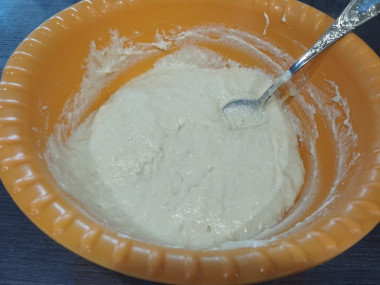 Жидкую основу перелейте в миску с мукой и тщательно перемешайте, чтобы тесто было без комочков. При необходимости добавьте ещё муки и вновь перемешайте до однородности.