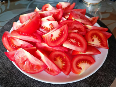 Помидоры вымойте, обсушите и нарежьте крупными дольками. Помидоры выбирайте сочные, но плотные. Мягкие плоды плохо держат форму, в процессе нарезки и приготовления они расползутся в бесформенную массу и испортят внешний вид блюда.