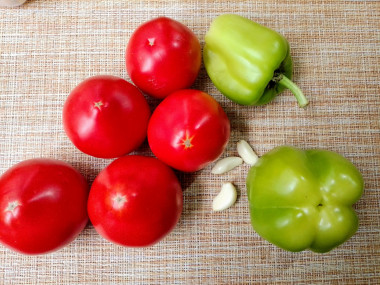 Как сделать помидоры с чесноком и перцем? Подготовьте все необходимые ингредиенты по списку.