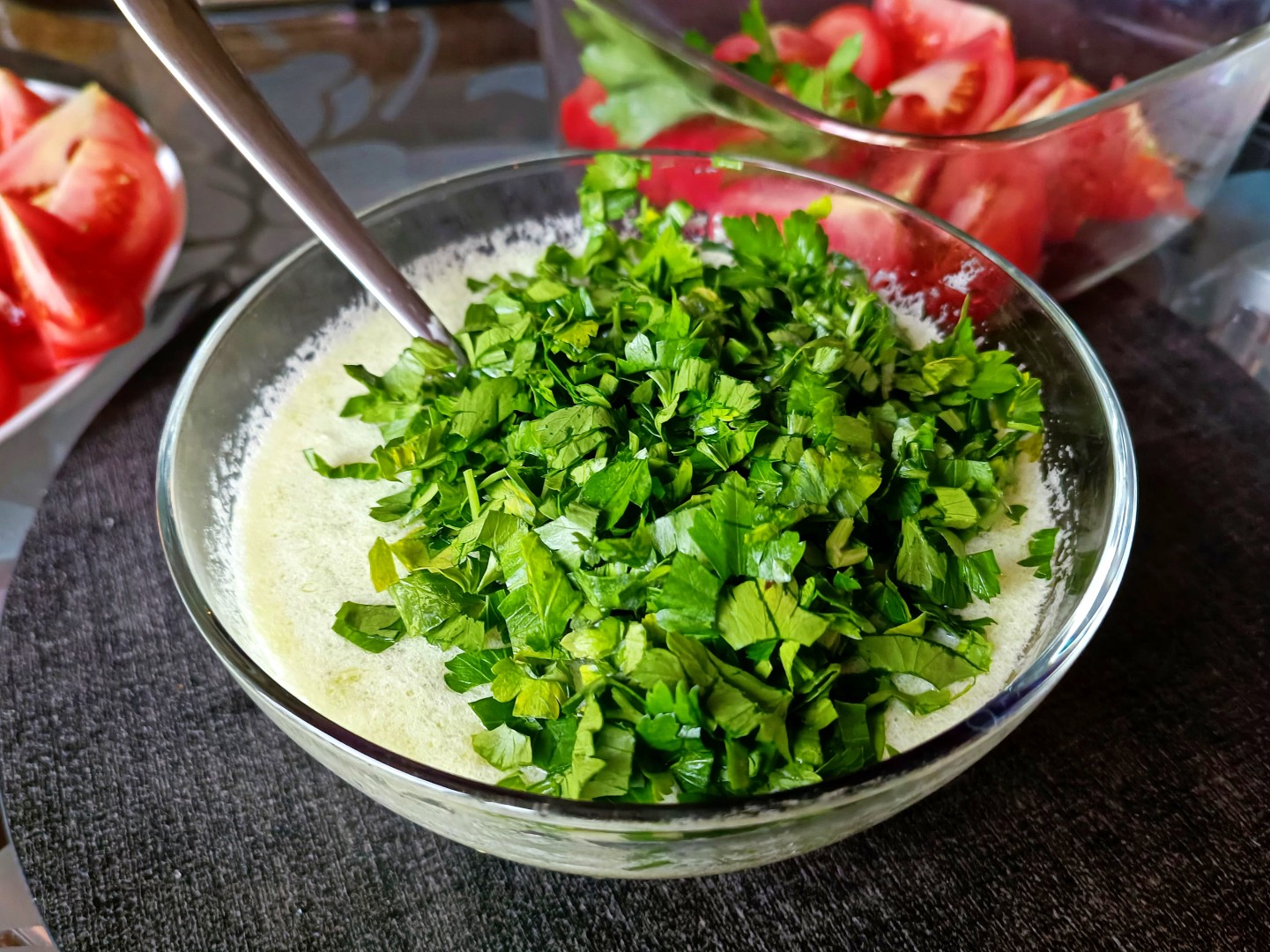 Кинзу вымойте, отряхните от влаги и мелко порубите. По желанию можете заменить или дополнить другой зеленью, например, укропом, петрушкой, кинзой, зеленым луком или использовать смесь разных трав.