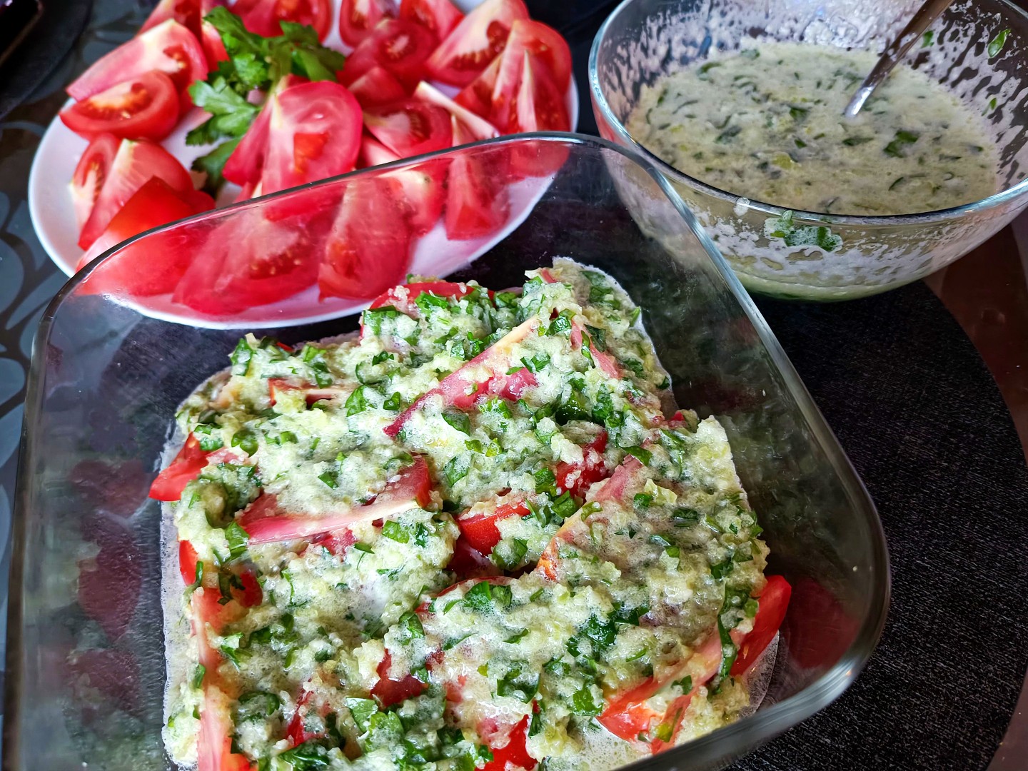 Готовила с небольшими изменениями: перец чили не добавляла, вместо кинзы использовала петрушку. Уксус был 9%, поэтому разбавила его водой, как и советовалось в рецепте. Уложила всё слоями в контейнере и убрала в холодильник, периодически перемешивая, чтобы верхние помидорки тоже хорошо пропитались.