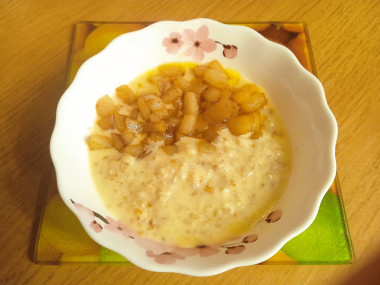 Вторую грушу нарезать дольками и обжарить на сковороде в сливочном масле до золотистого цвета. Посыпать грушевые ломтики корицей и полить медом. Подавать кашу, выложив на неё ломтики жареной груши!