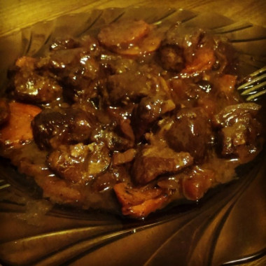 Затем подлейте немного горячей воды, накройте крышкой и тушите на небольшом огне минут 20. Мясо должно стать мягкое. Дождитесь, чтобы вода полностью выкипела.