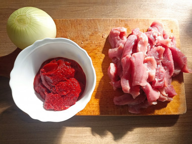 Мясо свинины нарежьте тонкими полосочками, примерно, одинакового размера.