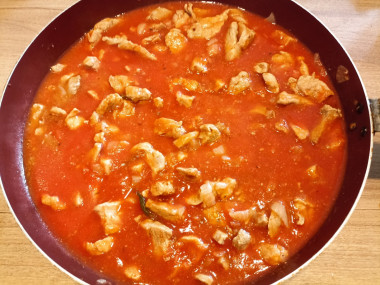 Получившийся томатный соус влейте в сковороду и, помешивая, доведите до кипения. Прогрейте все вместе в течение минуты и снимите с огня. При закипании томатный соус станет гуще. Добавьте в сковороду свежую петрушку и перемешайте. Оставьте мясо постоять под крышкой минут на 5-10, чтобы оно настоялось.