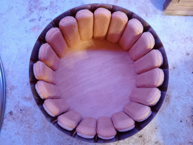Как сделать торт из печенья савоярди? Берем печенье савоярди и отрезаем нужную длину для бортиков. Выкладываем бортики сахарной стороной наружу.