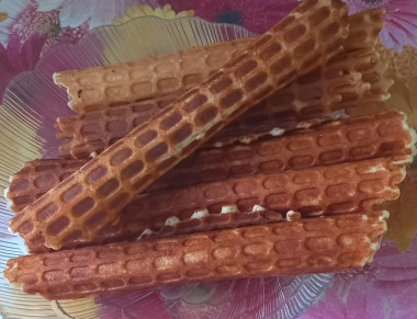 Я немного модернизировала рецепт. Внесла в состав два продукта разрыхлитель и воду. При добавлении разрыхлителя вафли приобрели новый вкус более тонкий и нежный, меньше крошатся, но остаются такими же хрустящими и такими во рту. Воду я добавила для тонкости вафли и разбавления густоты самого теста. Адаптировала под свою советскую вафельницу.