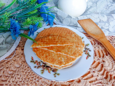 Готовила из расчета на 8 порций. У меня получилось 8 вафель среднего размера. Сливочного масла у меня оставалось 50 граммов, недостающее количество заменила маргарином. Вместо ванилина добавила половину чайной ложки ванильного сахара. Выпекала вафли я в специальной форме для газовой плиты.