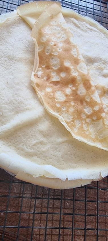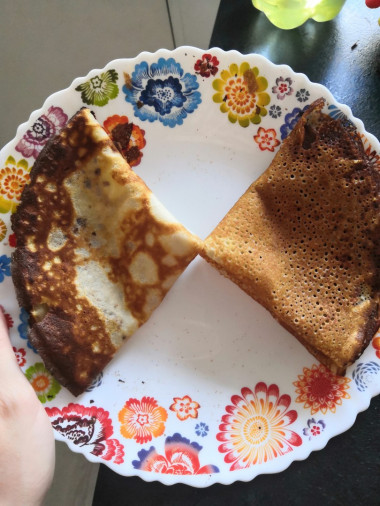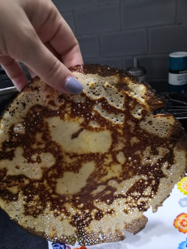 Хорошие блины. Муки взяла немного больше. Сахара в половину меньше, из расчёта на не сладкую начинку. Пластичные блинчики, хорошо переварачивались, не рвались.