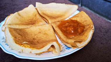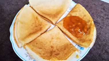 Получились чудесные блинчики! Муки добавила немного больше, чем в рецепте. Но это и понятно, у всех она разная. Блинчики тоненькие, мягкие, с ажурным хрустящим краешком. Улетели и со сметаной, и с абрикосовым вареньем.