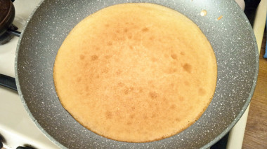 Поставьте на огонь сковороду для блинов. Хорошо разогрейте ее. Добавьте немного растительного масла. Прогрейте масло на сильном огне, затем убавьте нагрев. Влейте порцию теста половником или большой ложкой и проверните сковороду, формируя тонкий блин. За счет того, что сковорода раскалена, на поверхности блина сразу начнут появляться дырочки. А как выбрать идеальную сковороду для разных блюд, читайте по ссылке ниже.