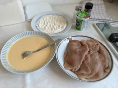 Теперь подготовьте все для кляра и панировки. Если яйца крупные, достаточно трех штук, если небольшие, второй категории, лучше возьмите 4 штуки, чтобы кляра хватило на все отбивные. Сметану можете брать любой жирности, у меня 15%, но не водянистую, чтобы кляр получился достаточно вязким.