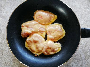 Сразу выложите отбивные на разогретую сковороду и обжарьте на растительном масле примерно по 3-5 минут с каждой стороны. Ориентируйтесь на свою плиту. В конце можете накрыть сковороду крышкой и жарить на медленном огне еще 3-4 минуты доводя отбивные до готовности. Мне не понадобилось дополнительно обжаривать мясо по крышкой, потому что отбивные были достаточно тонкими и курица хорошо прожарилась.