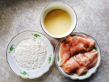 Муку для панировки высыпьте в миску. В муку также можете добавить немного соли по желанию. Куриные ломтики слегка обваляйте в муке, так кляр будет лучше обволакивать мясо.