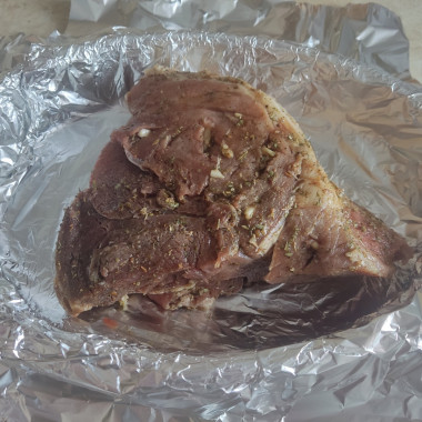 Заверните мясо в фольгу. Я для надежности взяла еще несколько слоев, чтобы при запекании не вытек сок. В таком виде вы можете оставить мясо промариноваться на несколько часов в холодильнике. Но можно запечь его сразу, что мы и сделаем.
