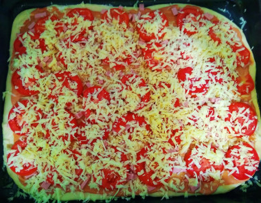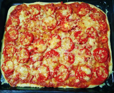 Прямо с утра дочь попросила срочно приготовить пиццу) Ну, что поделаешь, тем более я от пиццы тоже не откажусь) Самое долгое, это 30 минут подождать, когда тесто отдохнет. Остальное все делается мгновенно. Тесто делить не стала, раскатала сразу на весь противень. К томатному соусу добавила еще ложку сметаны, мне кажется так сочнее получается. Колбаса в холодильнике была вареная, поэтому я ее мелко порезала и распределила по тесту. И конечно помидоры с сыром)