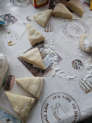 Тесто выложите на рабочую поверхность, присыпанную мукой. Разделите его на 8 частей.