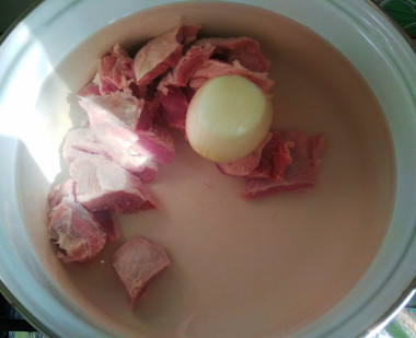 Мясо вымойте, обсушите. Выложите в кастрюлю вместе с целой очищенной луковицей, залейте холодной водой.