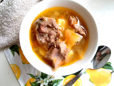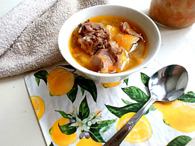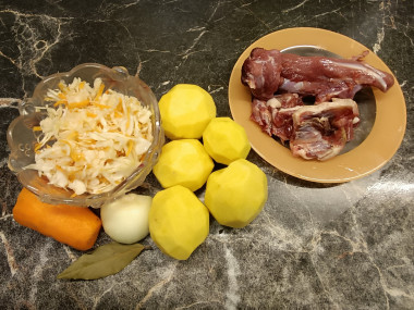 Как сварить классические щи с квашеной капустой? Рецепт очень простой. Подготовьте все необходимые ингредиенты по списку и начните с приготовления бульона. Можете брать говядину или телятину. Чтобы бульон был более наваристый, берите мясо с костью. Это может быть голяшка, лопатка на кости. У меня говяжьи ребрышки, но на них очень много мяса. Если найдете такие (ведь с ребер мясо иногда специально срезают), то можно сделать с ними.