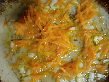 Затем добавьте морковь и жарьте, помешивая, до мягкости еще 3-5 минут.