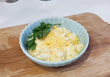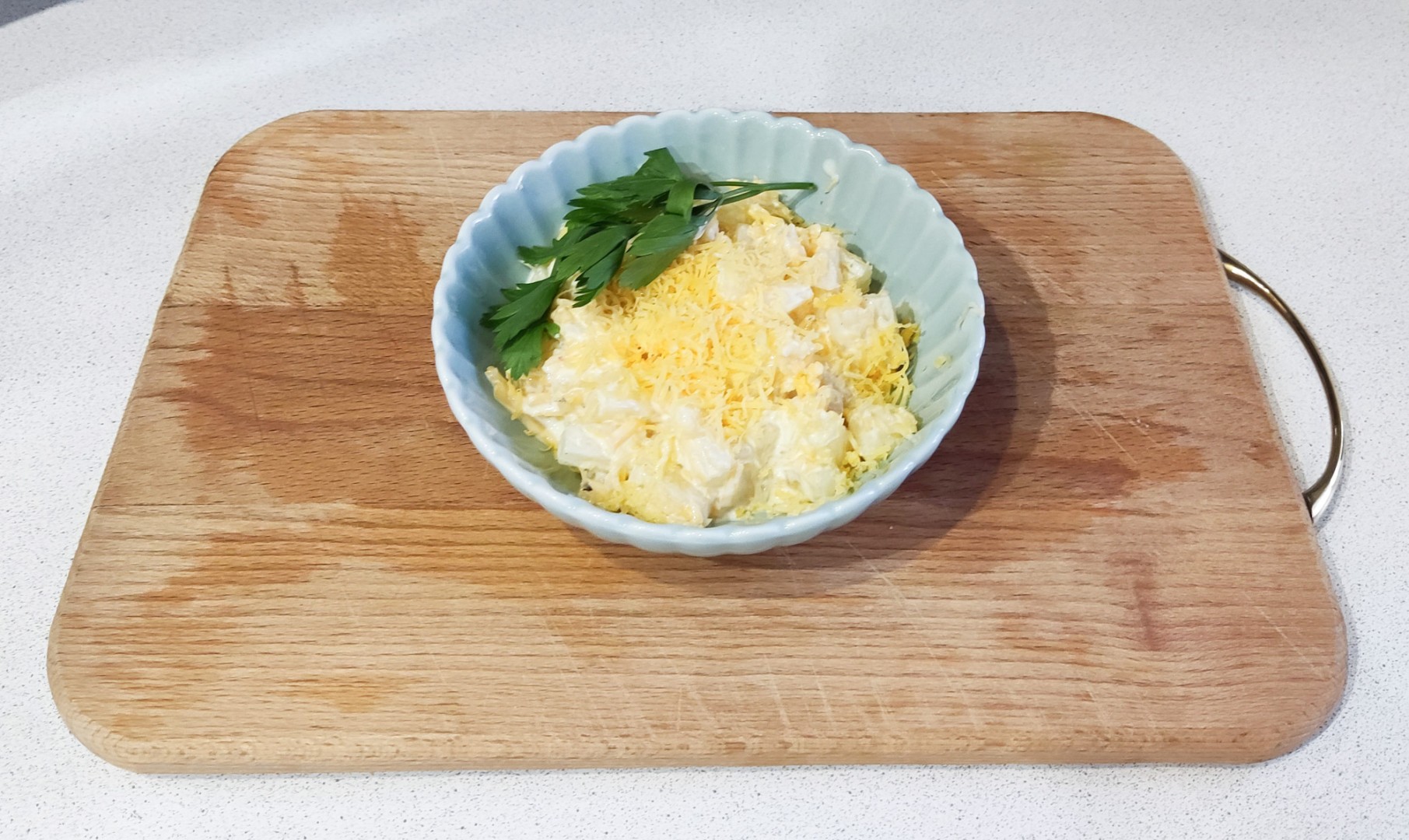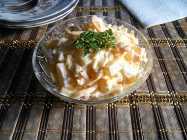 Я в такой салат ложу ещё порезанную кубиками ветчину. Только ветчины кладу совсем немного. Хорошо ещё сочетается с консервированной кукурузой. Но тогда ветчину класть не нужно.