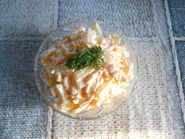 Ананас у меня был изначально порезан кусочками, поэтому я решила его не измельчать. Сыр взяла полутвёрдый. Салат совсем немного посолила. Салат у меня чуть-чуть "поплыл" - ананас был плохо отжат и, соответственно, дал ненужную влагу, однако, на вкусе это не сказалось. Быстрый в приготовлении, замечательный во вкусе - этот салат подойдёт и на праздник, и на перекус, и на ужин. Благодарю за рецепт!