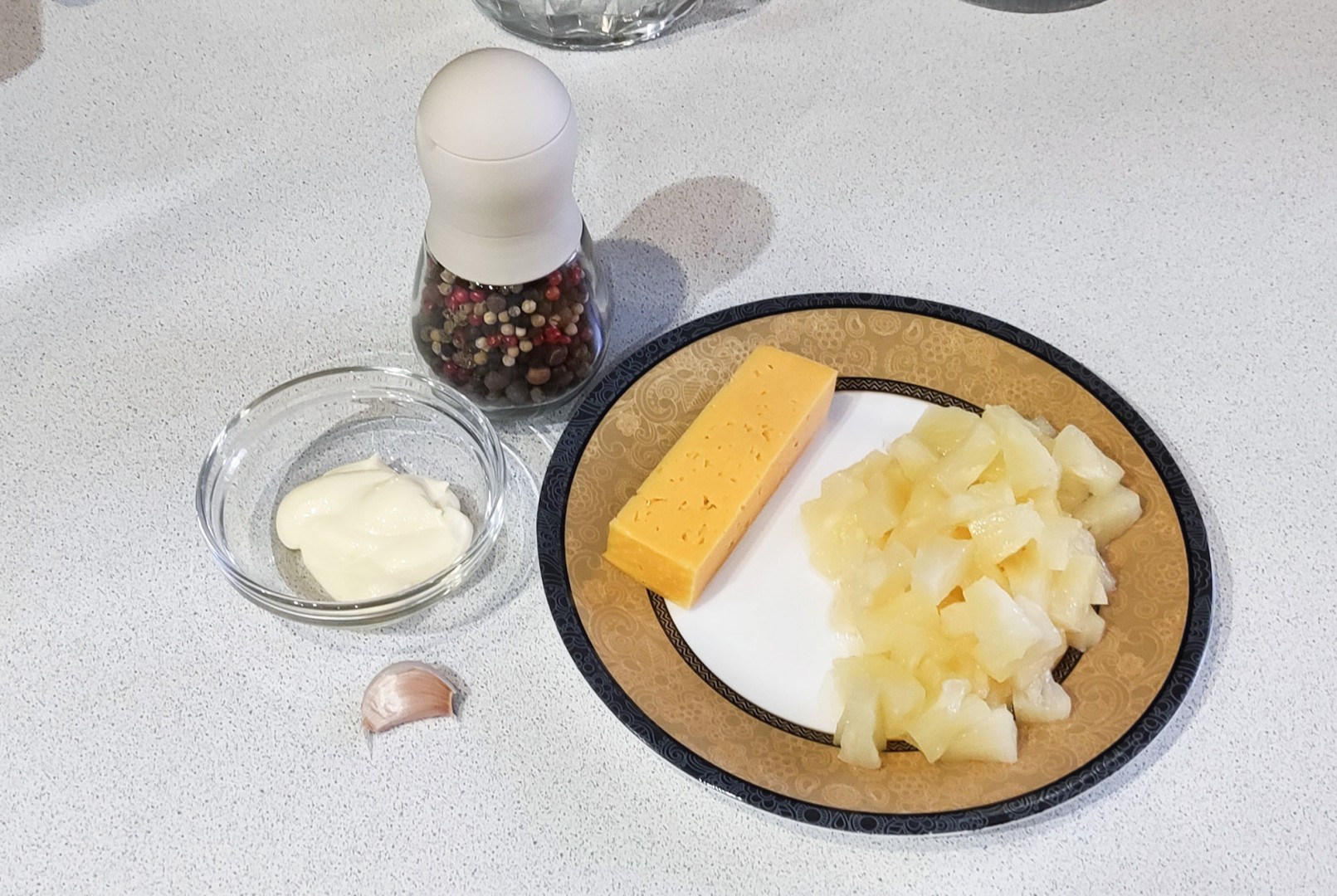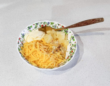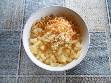 В салатнике подходящего размера смешайте вместе ананасы, сыр и пропущенный через пресс чеснок.