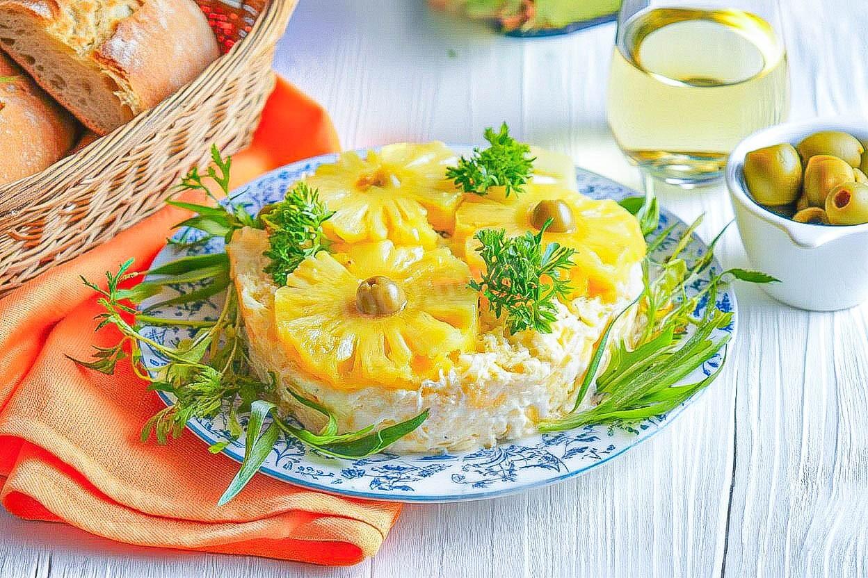 Салаты с сочетанием ананасов и сыра приобрели популярность в 90-е годы, когда консервированные фрукты перестали быть дефицитом. Этот рецепт — вариация на тему классического «Оливье» и «Крабового», но с более изысканным и запоминающимся вкусом. Интересно, что такое сочетание часто называют «европейским» за его легкость и пикантность.